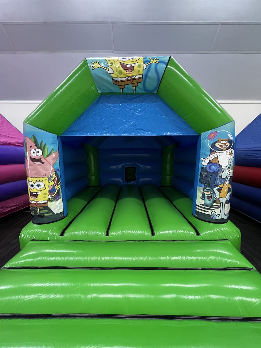 This Sponge themed bouncy castle has pictures of various sponge Bob characters on the side pillars and Sponge Bob Logo on the top arch.