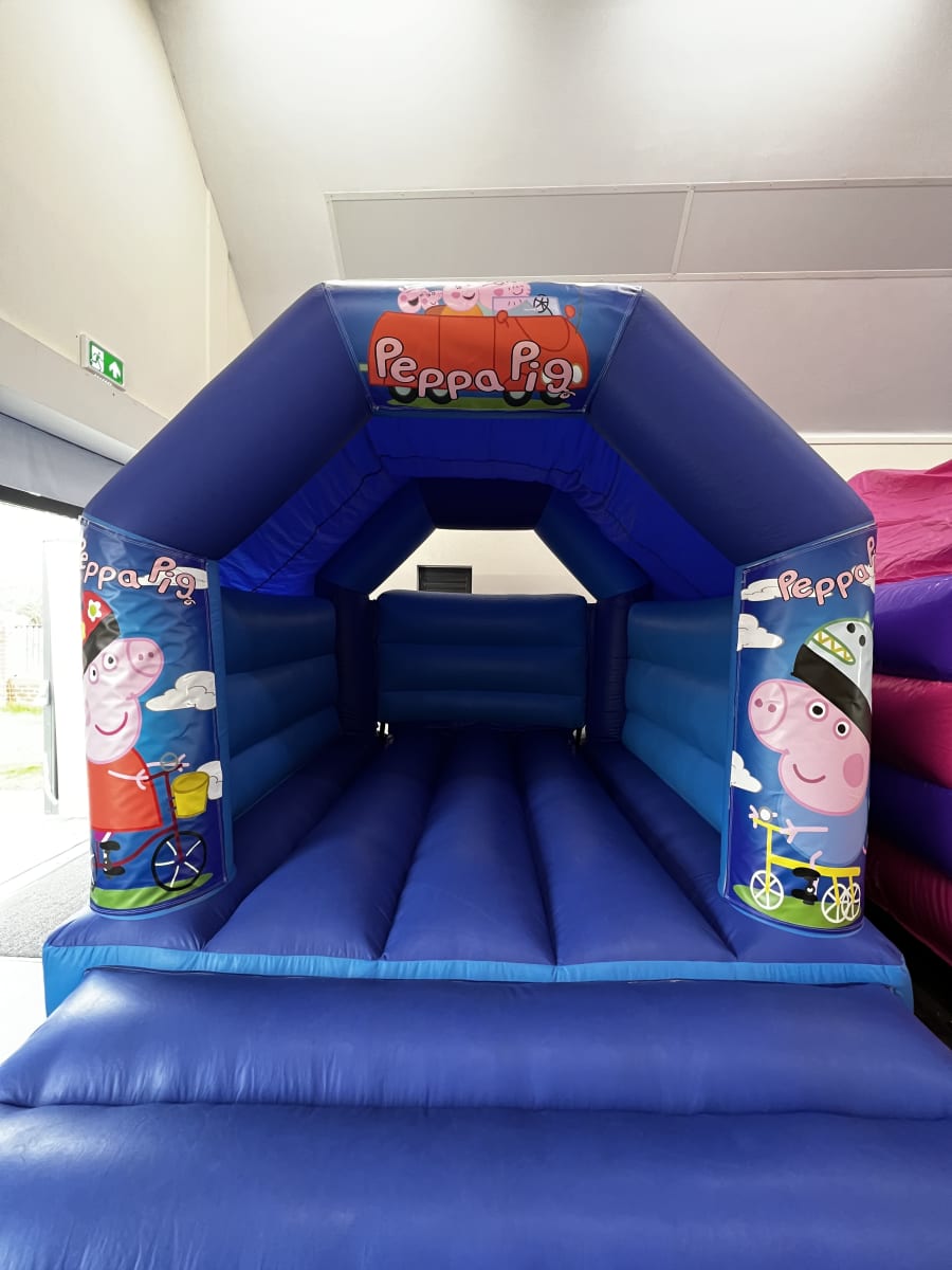 This Peppa Pig themed bouncy castle has pictures of Peppa Pig characters on the side pillars and Logo on the top arch.