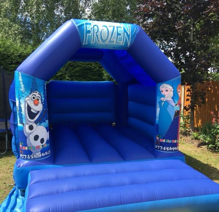 This Frozen bouncy castle has pictures of Olaf, Elsa and Anna on the side pillars and FROZEN on the top arch.
