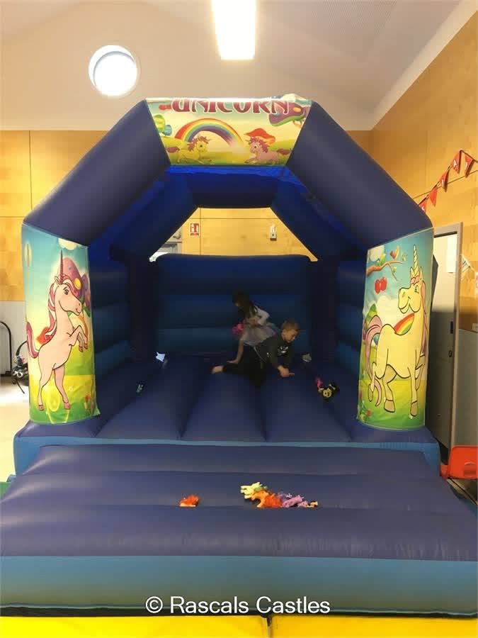 This Unicorn & Ponies bouncy castle has pictures of cute little unicorns on the front.