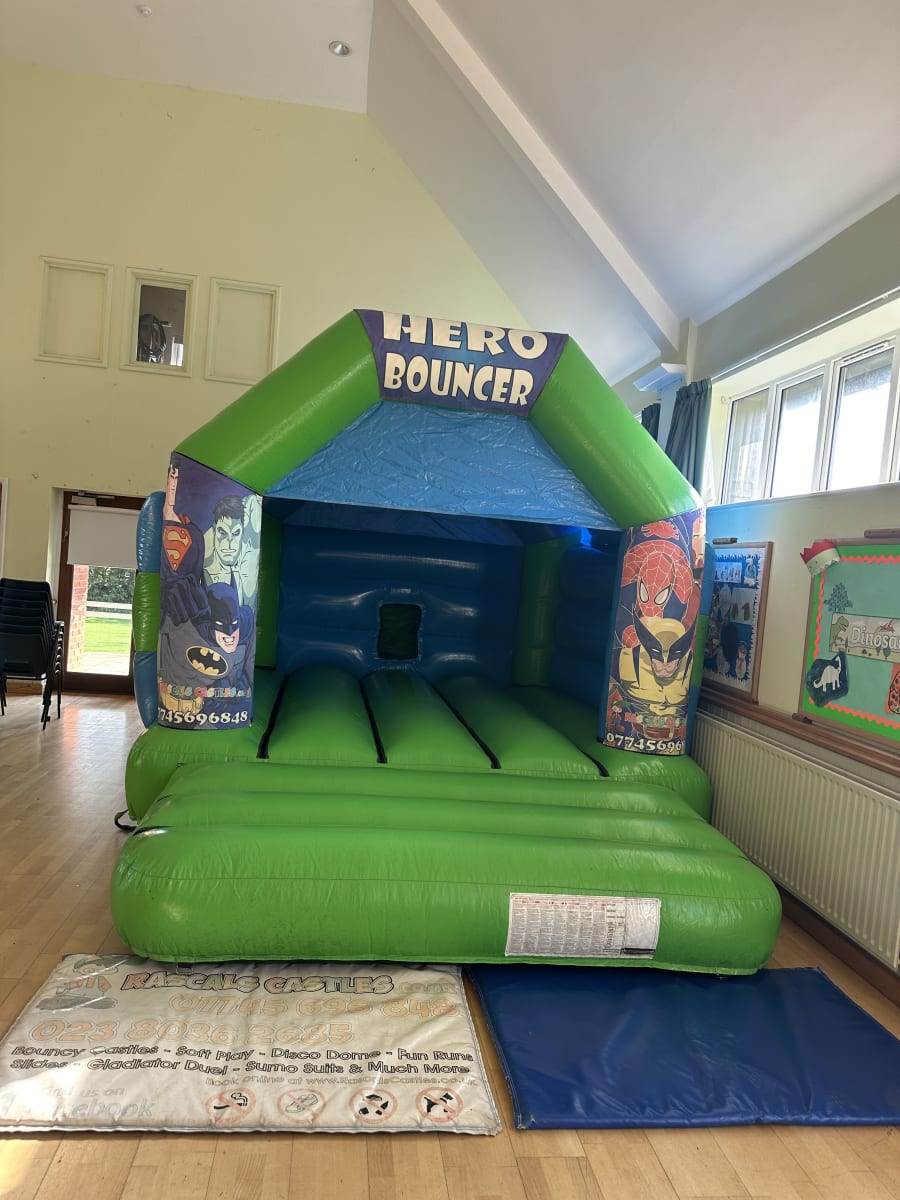 To check LIVE availability and to book online please use the red buttons below. You will then be taken to a bookings page where you will have the option to book Blue & Light Blue / Blue & Red / Green & Blue / Pink & Purple Hero Themed Children's Bouncy Castle.