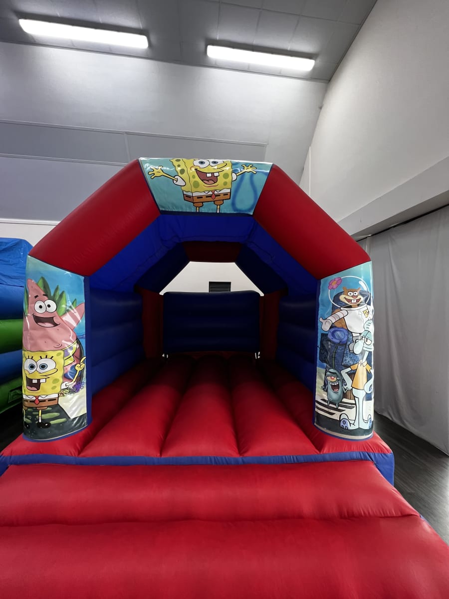 This Sponge themed bouncy castle has pictures of various sponge Bob characters on the side pillars and Sponge Bob Logo on the top arch.