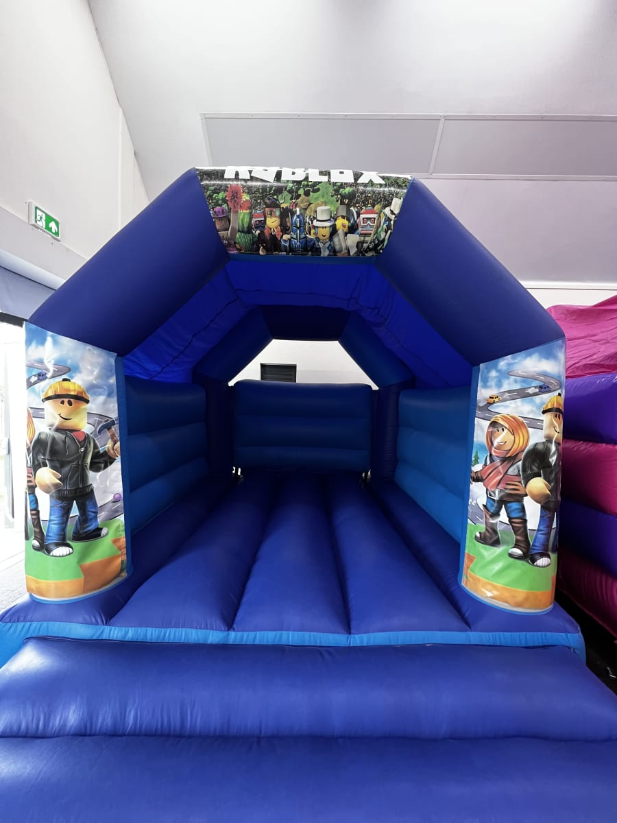 This Roblox themed bouncy castle has pictures of various Roblox characters on the side pillars and Roblox Logo on the top arch.