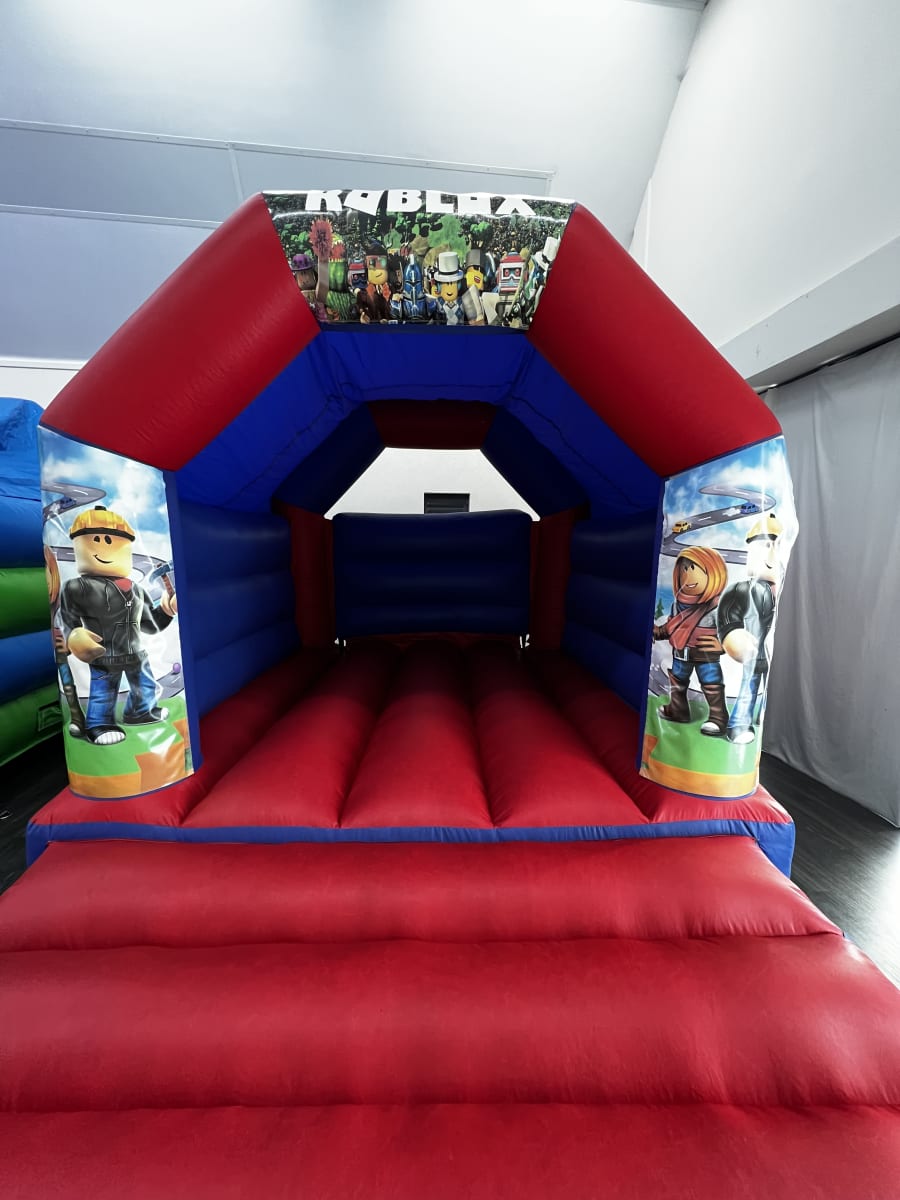 This Roblox themed bouncy castle has pictures of various Roblox characters on the side pillars and Roblox Logo on the top arch.