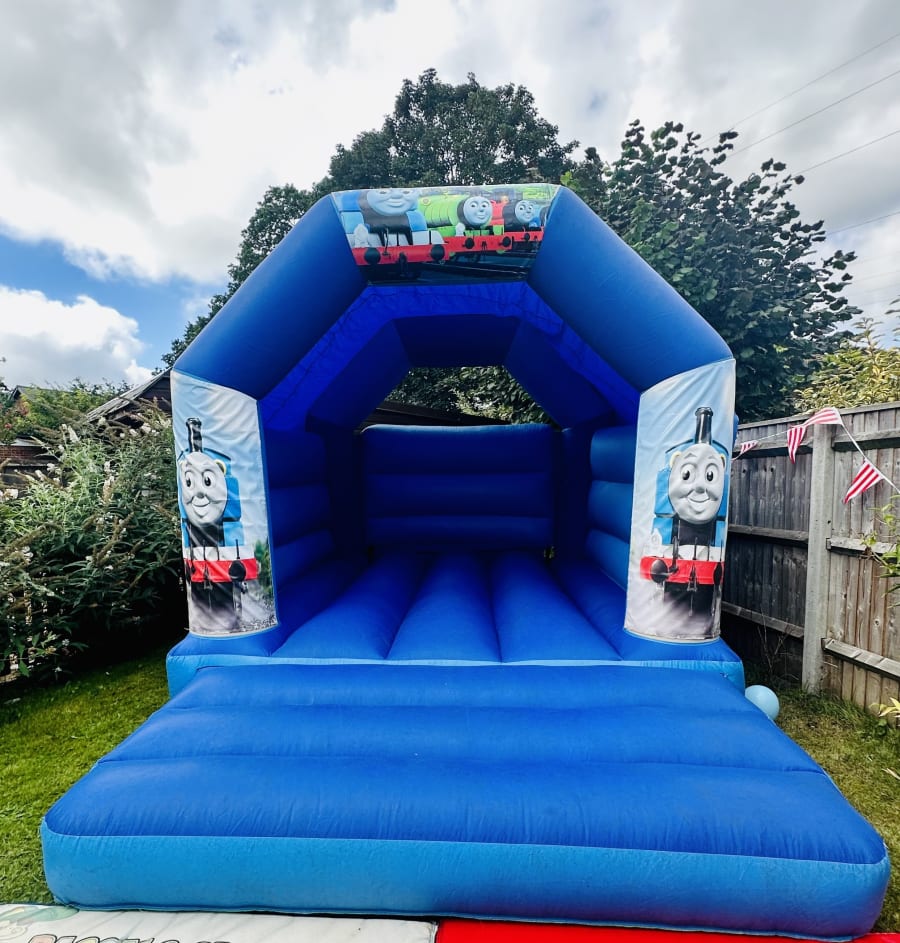 This Thomas themed bouncy castle has pictures of Thomas on the side pillars and Thomas Logo on the top arch.