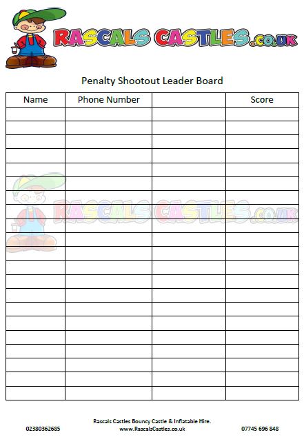 When this attraction is run at events we can also supply a "leader board" chart to keep track of who has the highest score of the day (if requested) the leader board can also be downloaded and printed from this page.